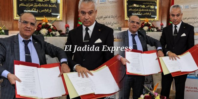 تواصل كلية العلوم القانونية و الاقتصادية والاجتماعية التابعة لجامعة شعيب الدكالي بالجديدة، انفتاحها على المحيط السوسيو إقتصادي بقيادة عميدها الأستاذ الدكتور خليل بنخوجة و تنزيلا لروح مشروع تطوير الجامعة 2019-2023 برئاسة الأستاذ الدكتور يحيى بوغالب، حيث عقدت إتفاقية شراكة و تعاون مع المحكمة الإبتدائية بسيدي بنور تحت اشراف رئيسها الأستاذ خالد خلقي و منسقها الأستاذ الدكتور محمد جراف من جانب كلية الحقوق بالجديدة، و ذلك خلال فعاليات الندوة الوطنية حول موضوع “التشريع العقاري والتنمية بالمغرب”، المنعقدة يومه الخميس 28 نونبر 2019 على الساعة العاشرة صباحا.